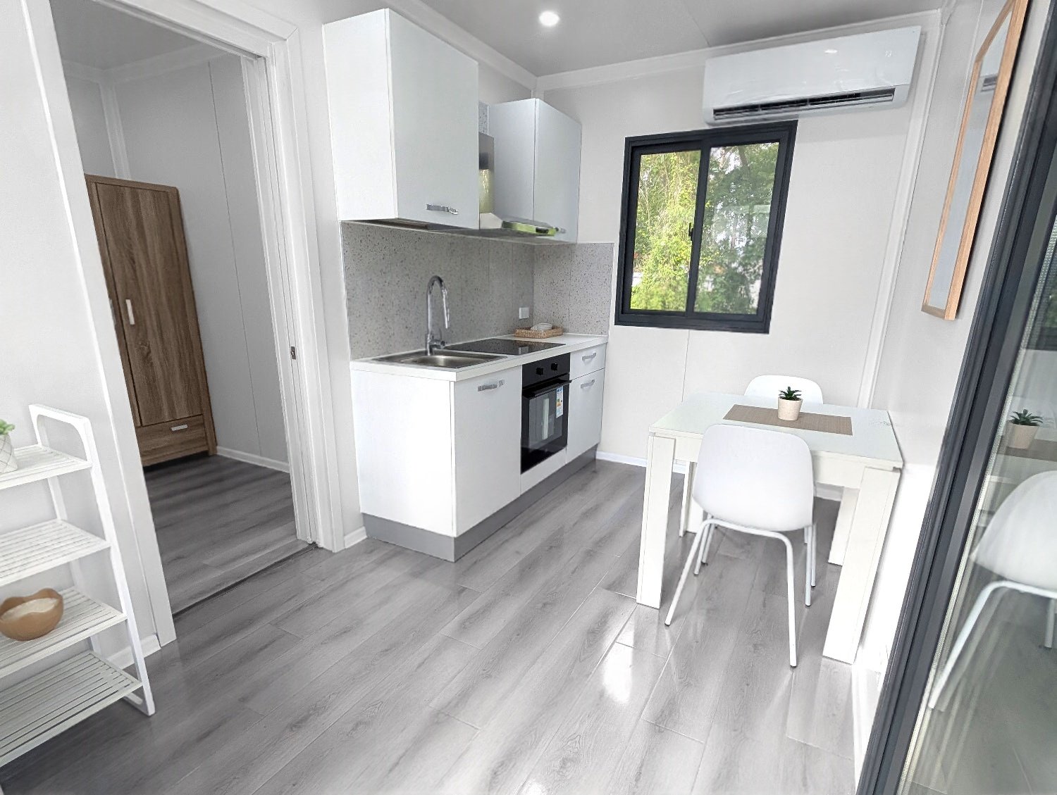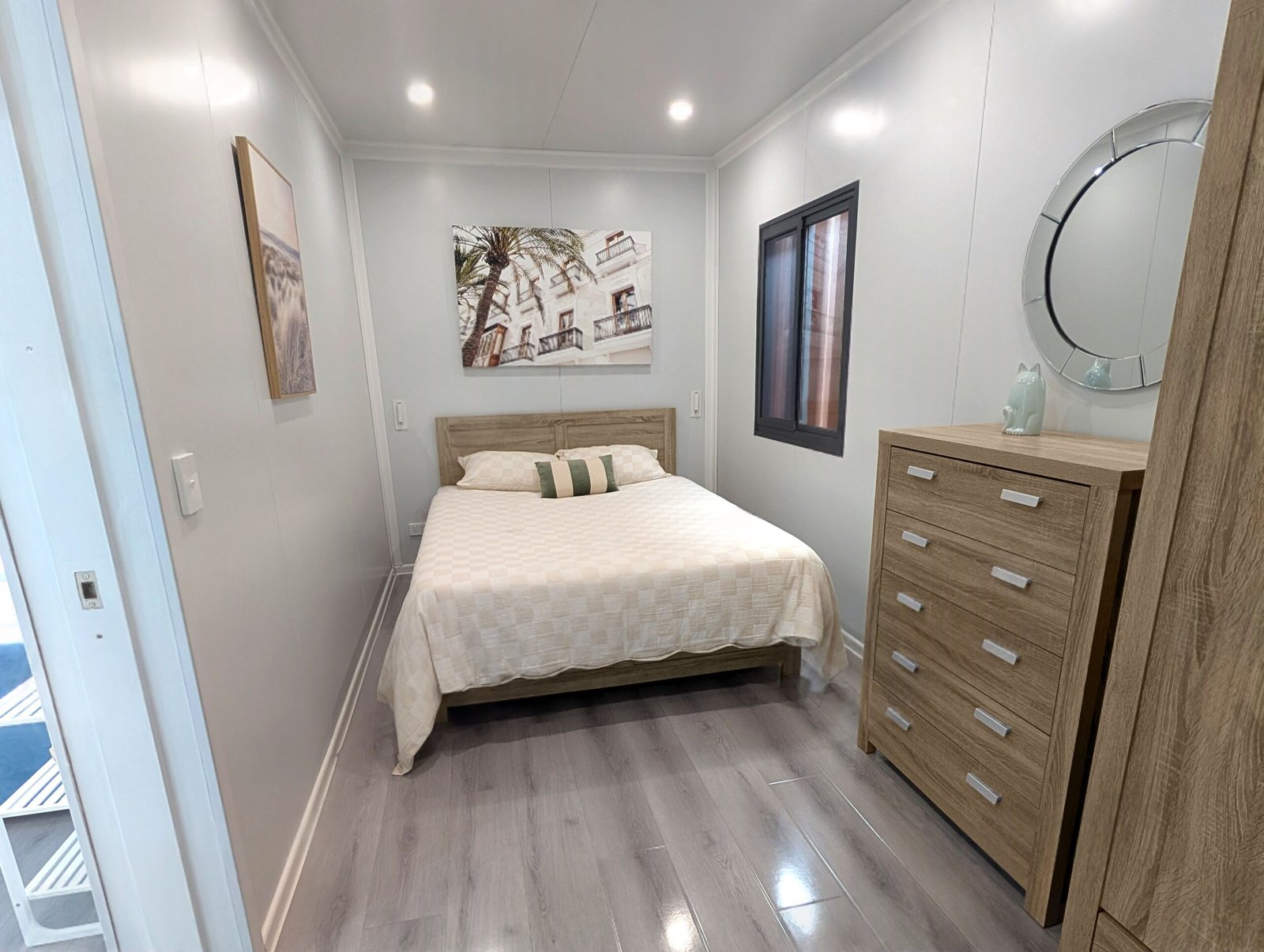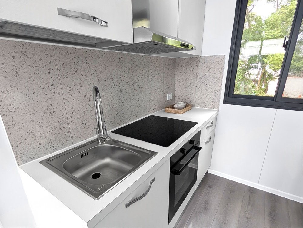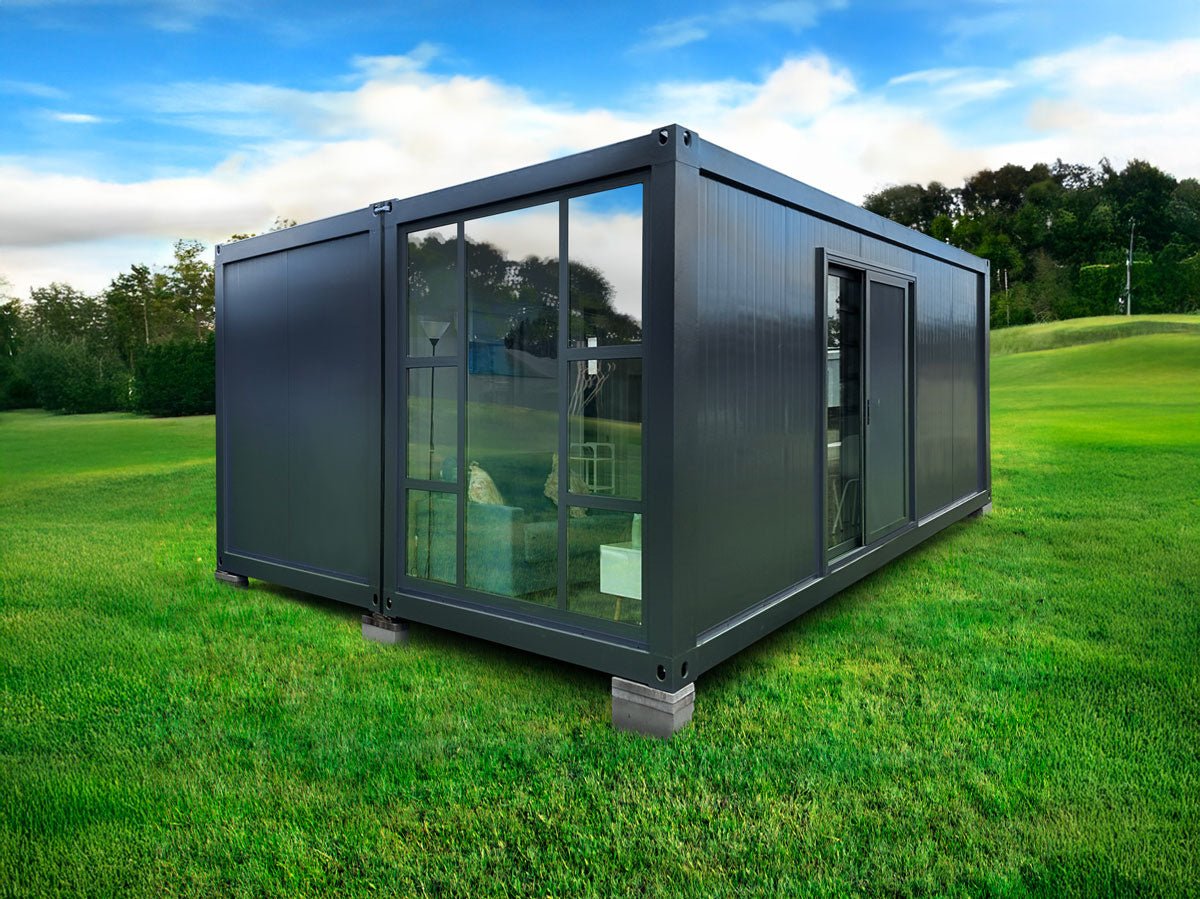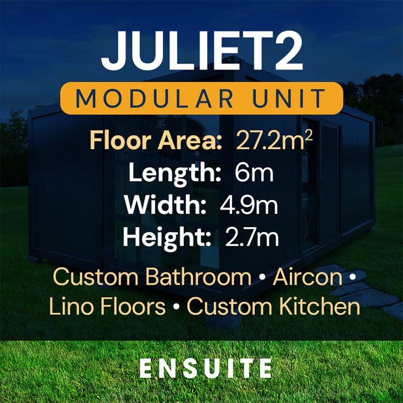 The JULIET2 Ensuite Modular Container Home. It is comprised of 2 modular container units attached together, and includes a bedroom, kitchen, bathroom and more. Great as a granny flat or secondary dwelling for your property.