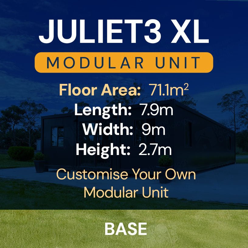 The JULIET3 XL Basic Modular Container Home, the perfect blank canvas. It is comprised of three 7.93m x 3m empty container units attached together, and includes a door, windows and electrical. Great as a canvas to modify and customise into your own perfect tiny home.