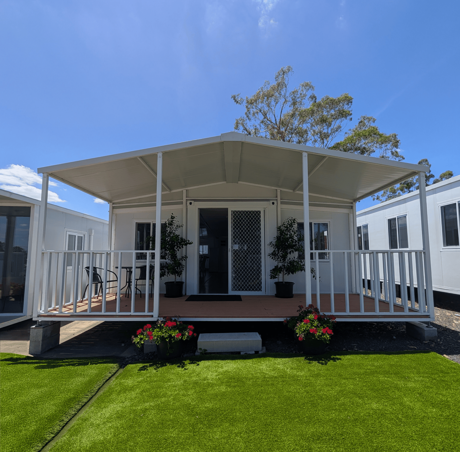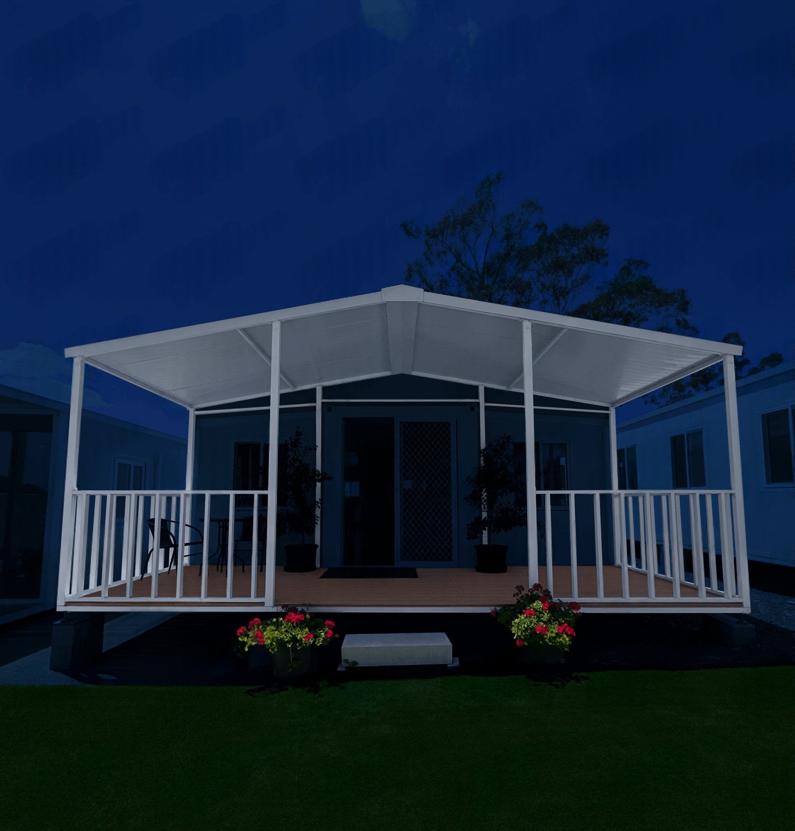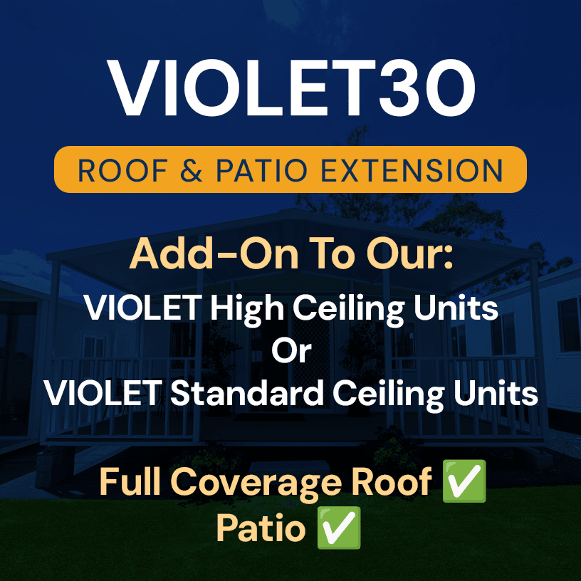 The VIOLET30 Full Length Roof with Patio Extension is the perfect addition to your VIOLET granny flat, tiny home, relocatable dwelling, beach cabin & more! Turn your VIOLET container home into an oasis with this simple add-on! Available for both our VIOLET standard and raised ceiling units.