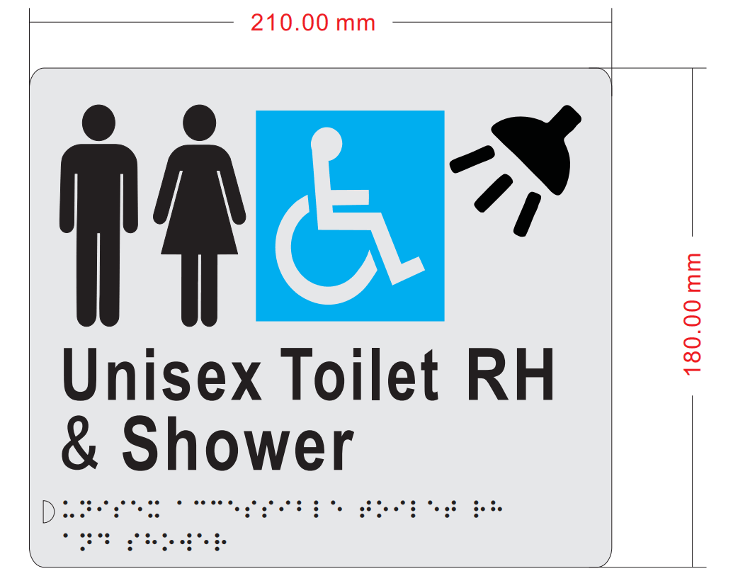 Unisex Toilet RH and Shower Acrylic Sign is a durable and clear signage solution, perfect for public and commercial restrooms. Easy to mount and long-lasting.